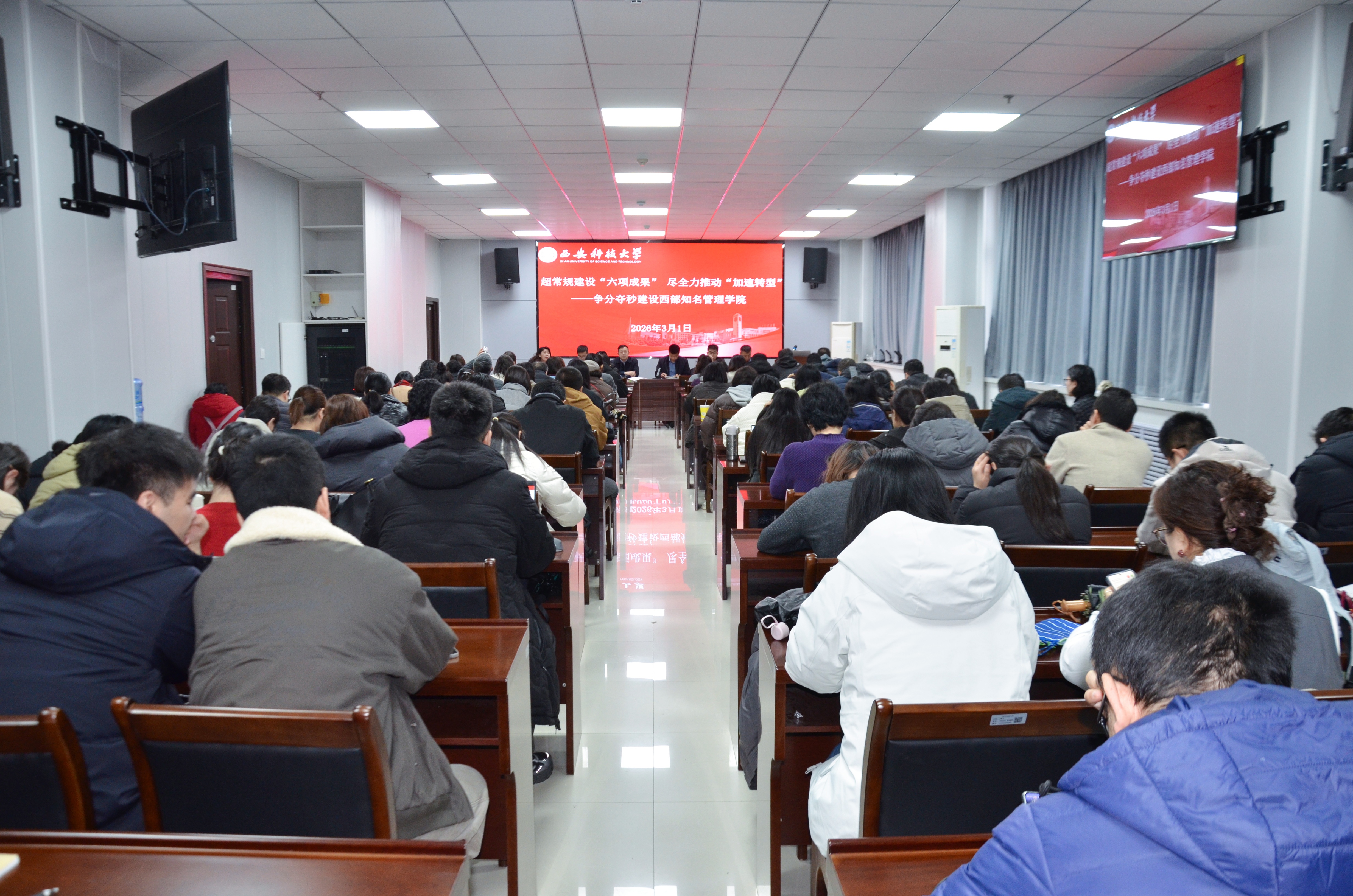 2026年3月1日上午,西安科技大学管理学院新学期第一次全体教职工大会在雁塔校区顺利召开。校党委副书记黄英维出席会议,学院领导班子成员及全体教工参加,会议由学院党委书记高朕栋主持。